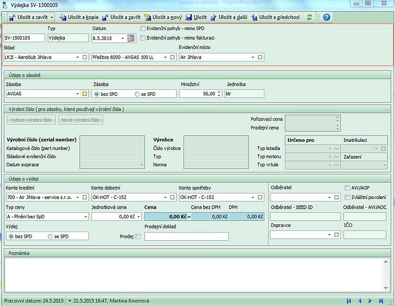 - konto spotřeby - doporučujeme nevyplňovat. Ve výdejce se do této kolonky vyplní poznávací značka letadla, do které bylo palivo natankováno a na kterém je evidována spotřeba.
