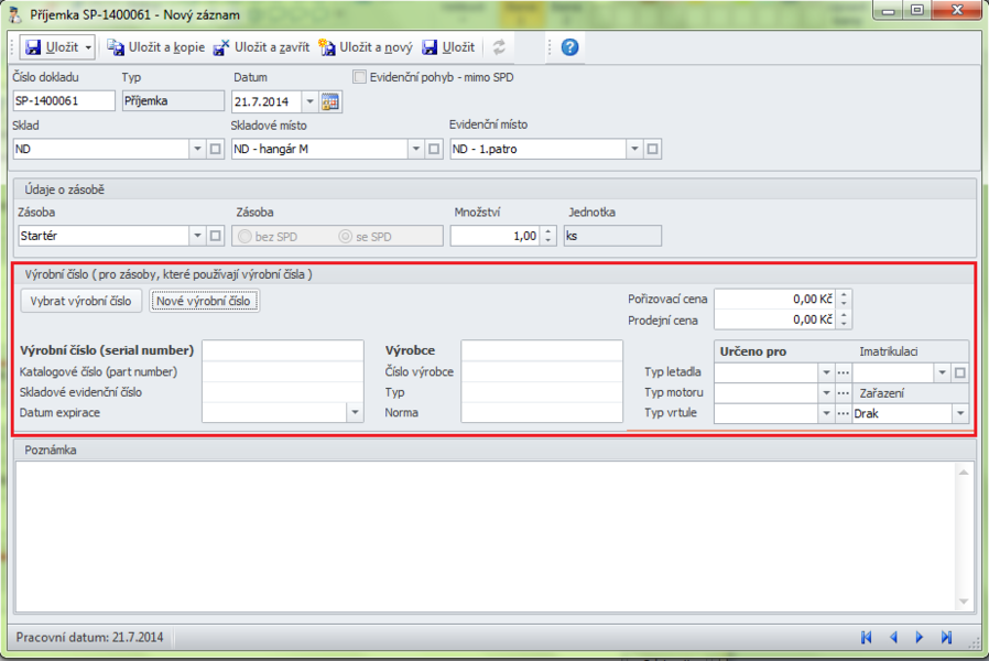 Příjemka - vloží záznam o příjmu zásoby na sklad, skladové místo a skladové evidenční místo.